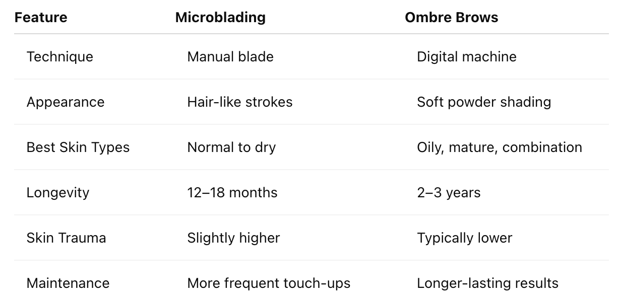 Microblading focuses on natural hairstrokes. Ombre brows provide soft, powdered definition. Combination brows blend both approaches.